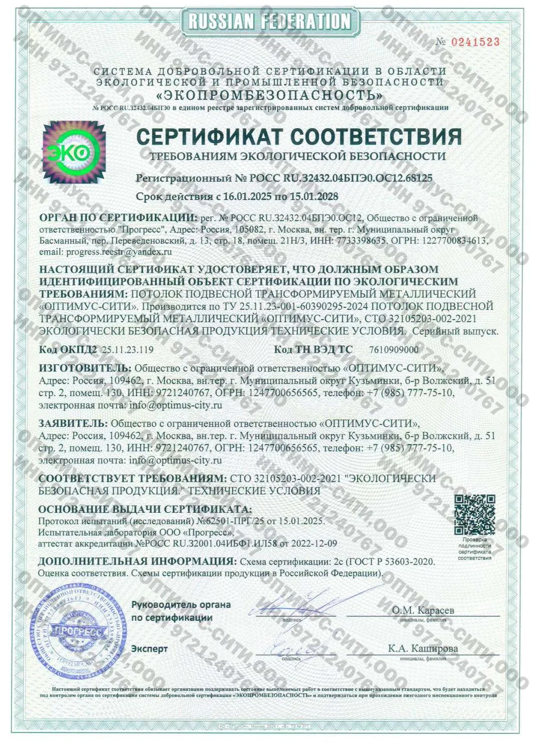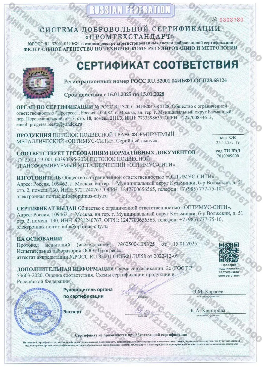 Добровольный сертификат соответствия на подвесной трансформируемый металлический потолок «ОПТИМУС-СИТИ», подтверждающий соответствие требованиям ТУ 25.11.23-001-60390295-2024.