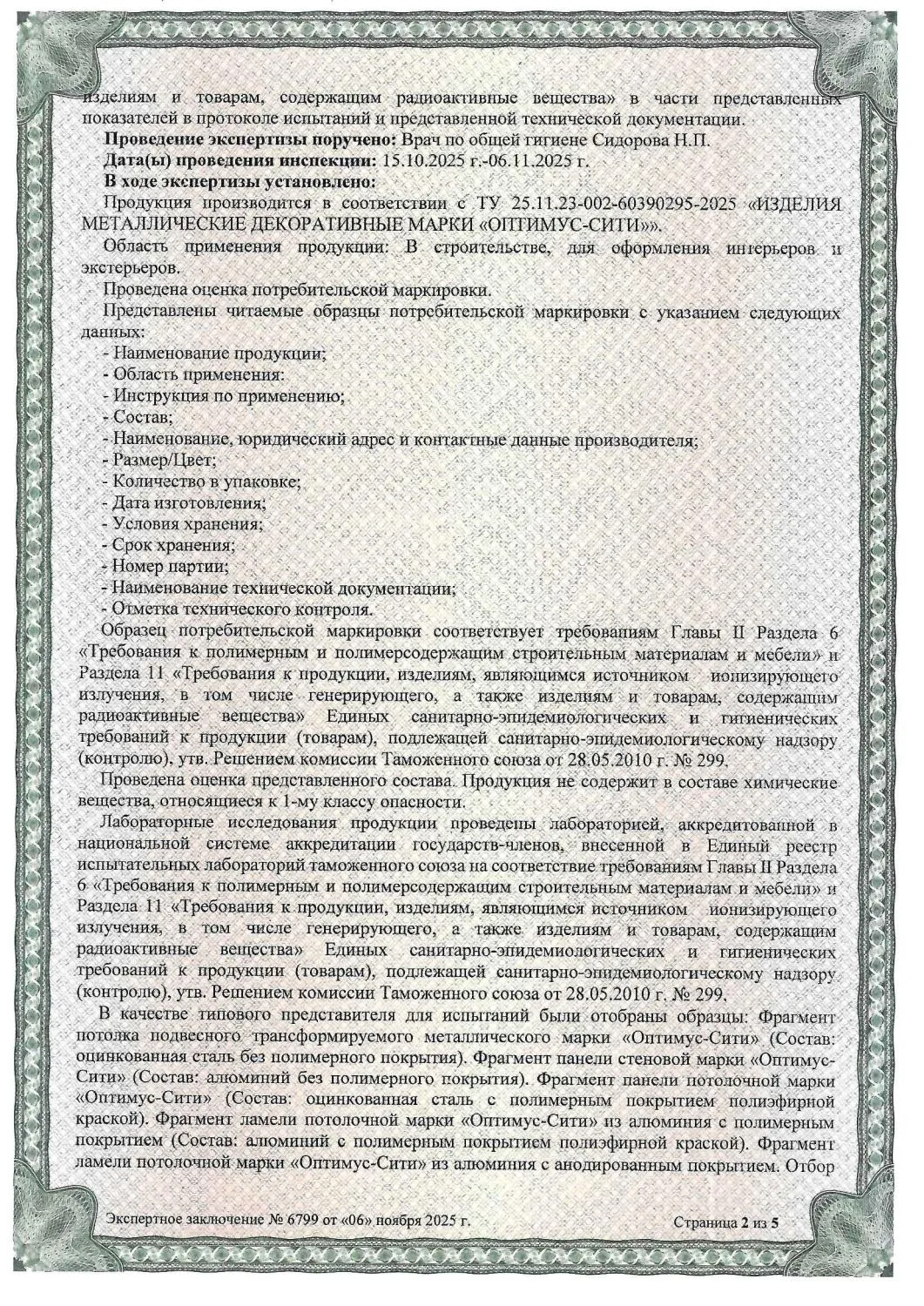 Сертификат СанПин ОПТИМУС-СИТИ № 6799 страница 2