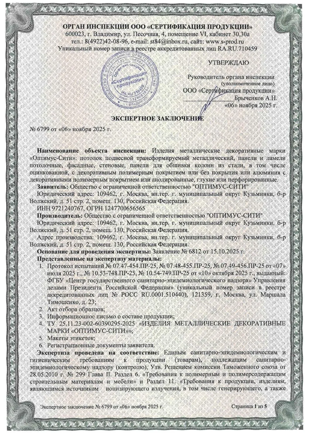 Сертификат СанПин ОПТИМУС-СИТИ № 6799 страница 1