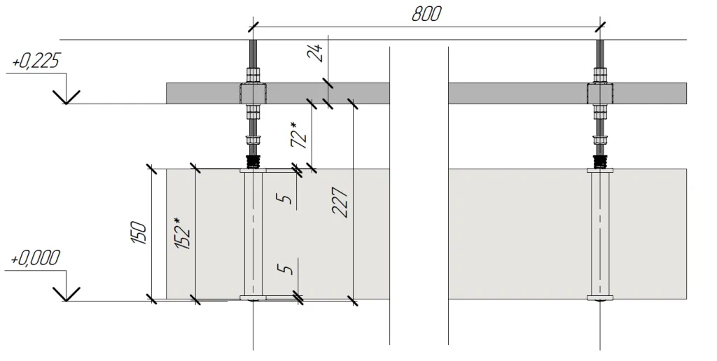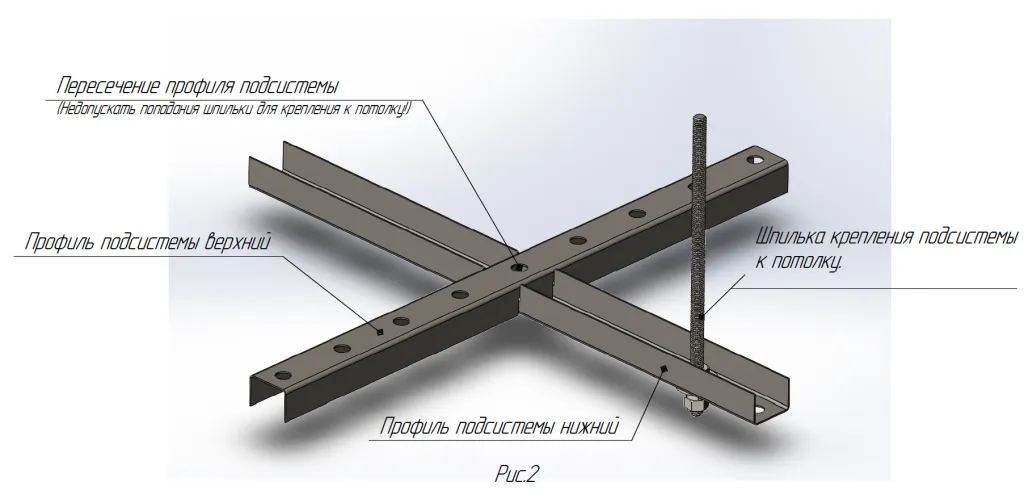На первом этапе в перекрытие монтируется шпилька крепления подсистемы. Далее на шпильку устанавливается профиль подсистемы.