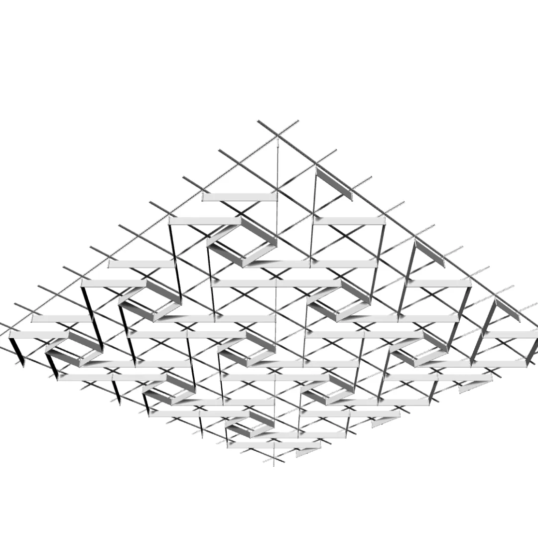 Модель используется в проектах, где необходим подвесной потолок с устойчивым полимерным покрытием, выраженной геометрией и стабильной эксплуатацией на больших площадях.