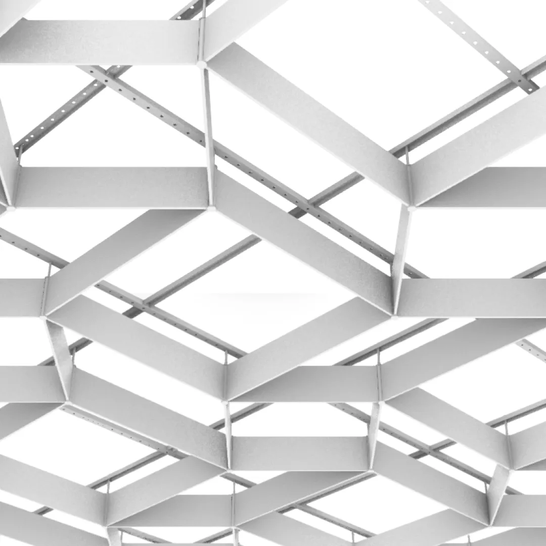 Геометрия модели формирует укрупнённый ромбический рисунок, в котором элементы создают более свободный архитектурный ритм и обеспечивают спокойное визуальное восприятие потолочной поверхности. Анодирование формирует прочный оксидный слой, защищающий алюминий от внешних воздействий, а сатинирование создаёт равномерную матовую поверхность без выраженных бликов.