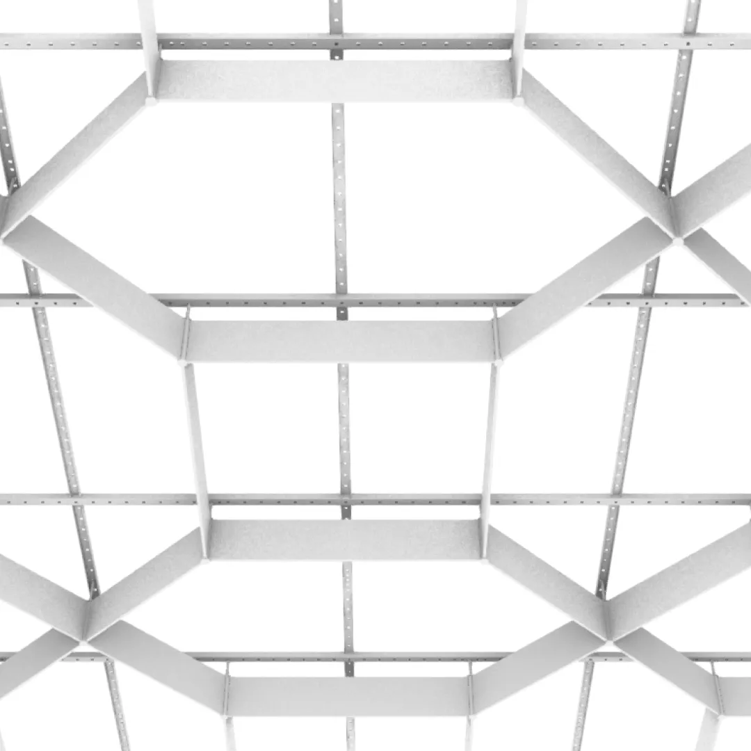 Геометрия модели формирует плотный ромбический рисунок, в котором модули создают собранный архитектурный ритм и обеспечивают равномерное визуальное восприятие потолочной поверхности на больших площадях. Анодирование формирует прочный оксидный слой, защищающий алюминий от внешних воздействий, а сатинирование создаёт равномерную матовую поверхность без выраженных бликов.