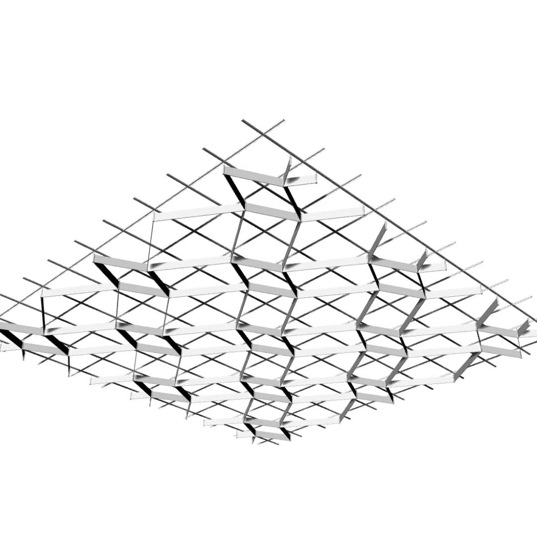 Конструкция формирует повторяющийся рисунок с равномерным расположением ромбических модулей, благодаря чему потолочная поверхность сохраняет визуальный порядок и чёткий архитектурный ритм.
