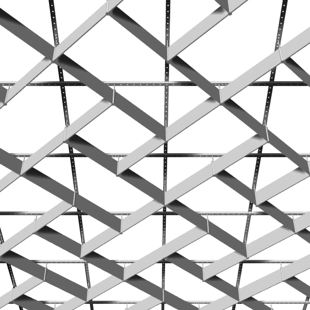 Конструкция формирует плотный повторяющийся рисунок, в котором диагональные элементы соединяются в регулярную ромбическую сетку и создают визуально упорядоченную потолочную поверхность.