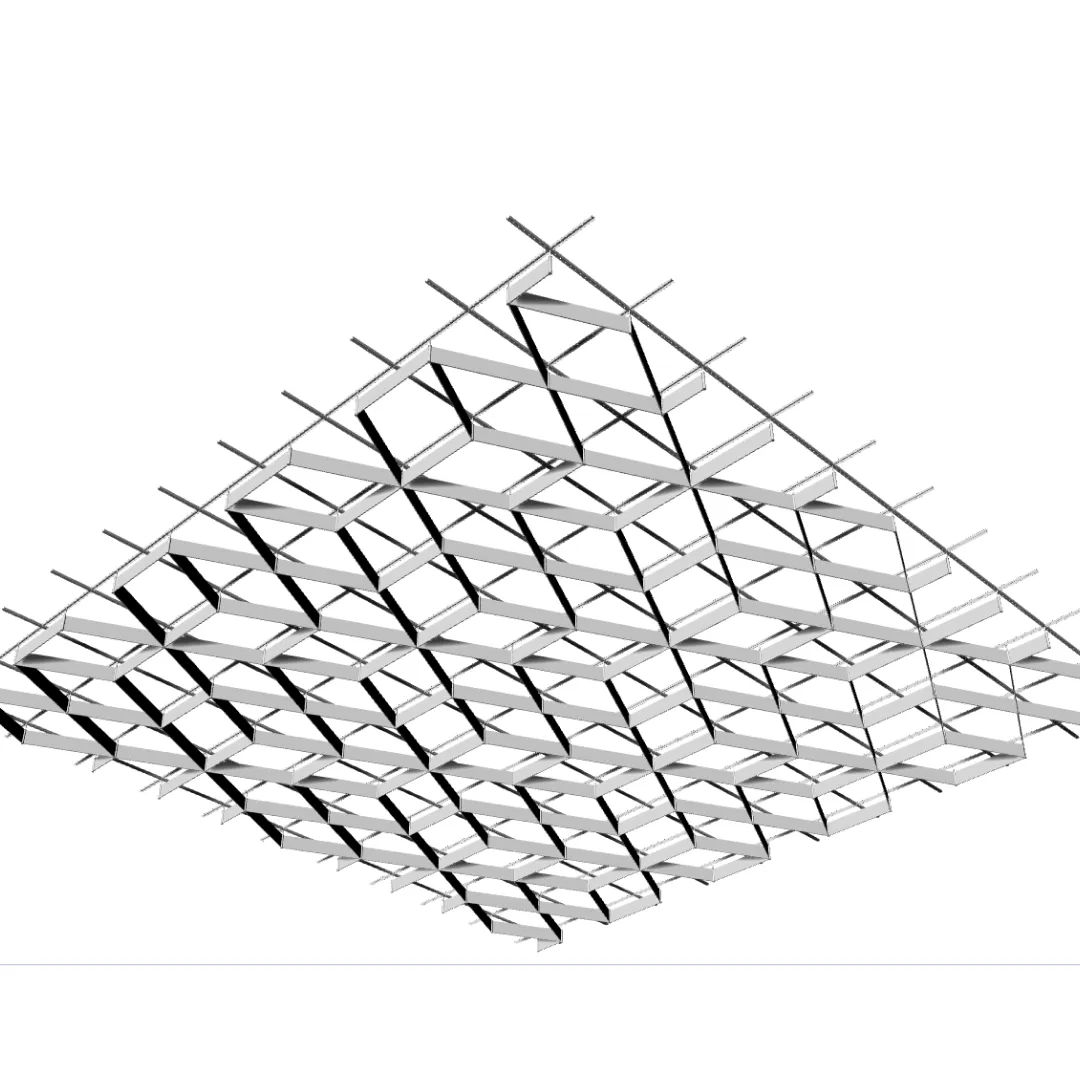 Конструкция формирует спокойный ромбовидный рисунок потолочной поверхности, при котором элементы создают равномерный диагональный ритм без выраженного доминирования отдельных направлений.