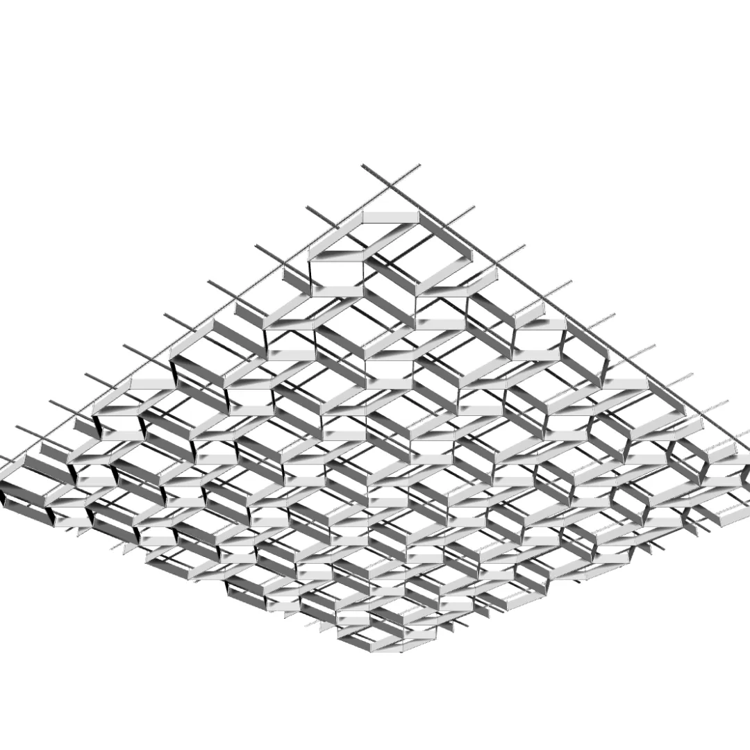 Конструкция формирует плотный ячеистый рисунок потолочной поверхности, в котором укрупнённые ромбовидные элементы создают собранный геометрический ритм и устойчивое визуальное восприятие пространства.
