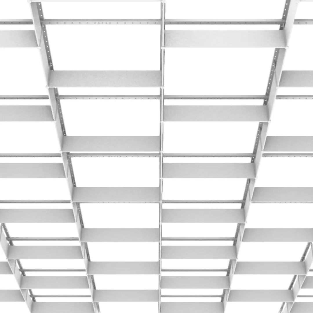 Конструкция формирует равномерную ячеистую структуру с чётким повторением модулей, благодаря чему потолочная поверхность сохраняет спокойный визуальный ритм и одинаковое восприятие на всей площади помещения.