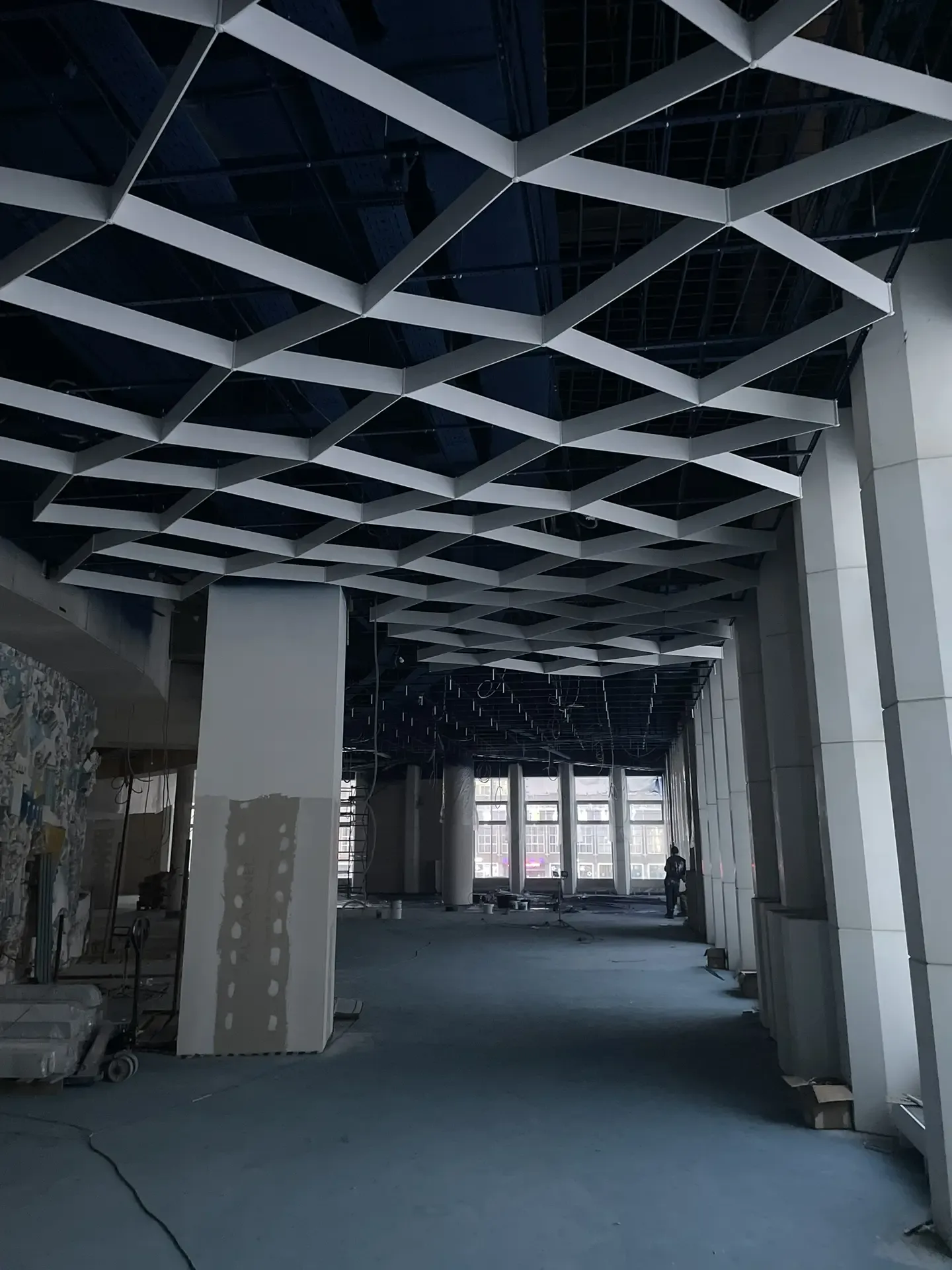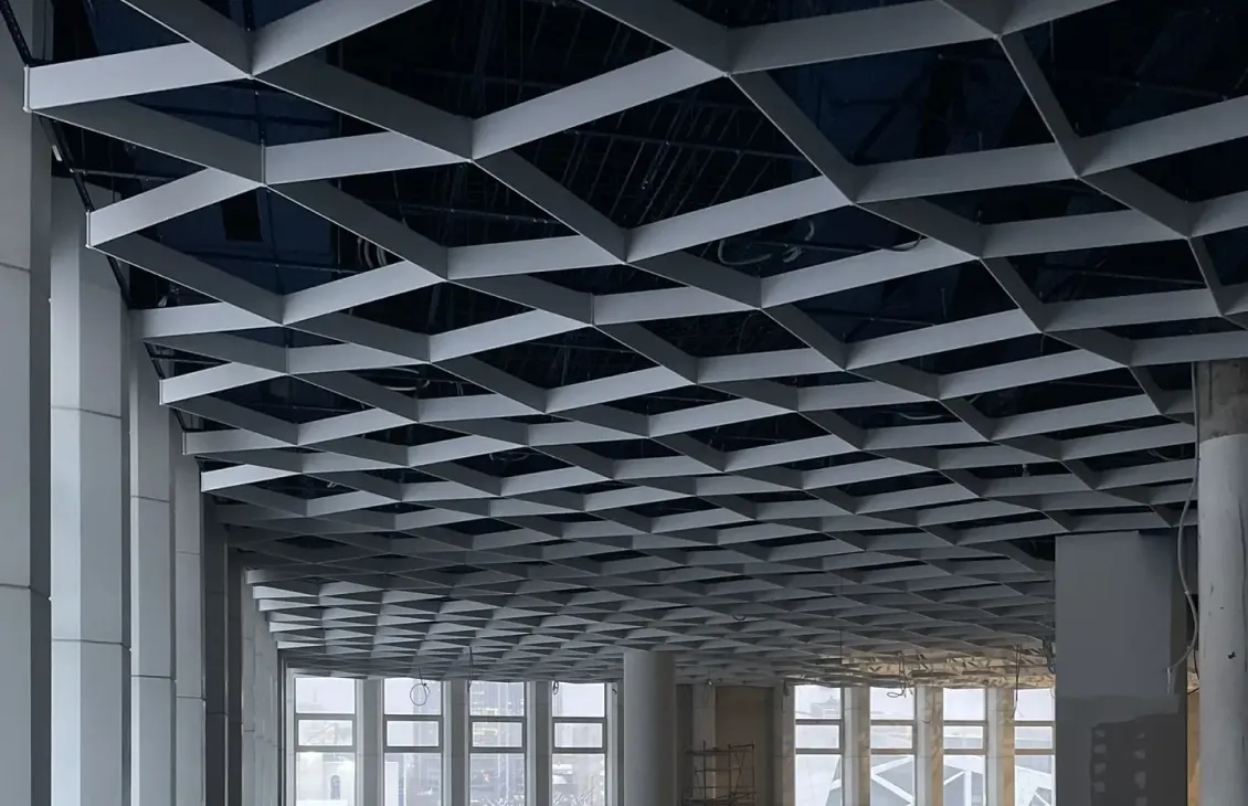 В проекте использована подвесная металлическая система с регулярной модульной геометрией, формирующей выразительный ритм потолочного пространства. Конструкция визуально организует длинный объём помещения и создаёт аккуратную архитектурную структуру без перегрузки интерьера.
